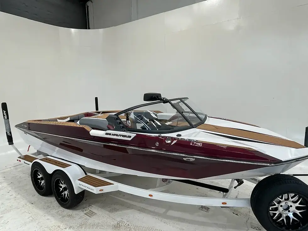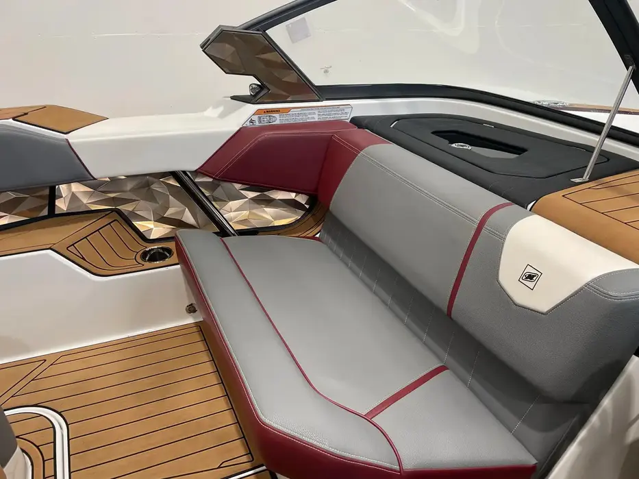 Finished in eye-catching Mystic White with Crimson Red Metal Flake and gold chrome accents, it comes with a platform cover and towable/mooring cover (non-tower). An exceptional choice for serious watersports